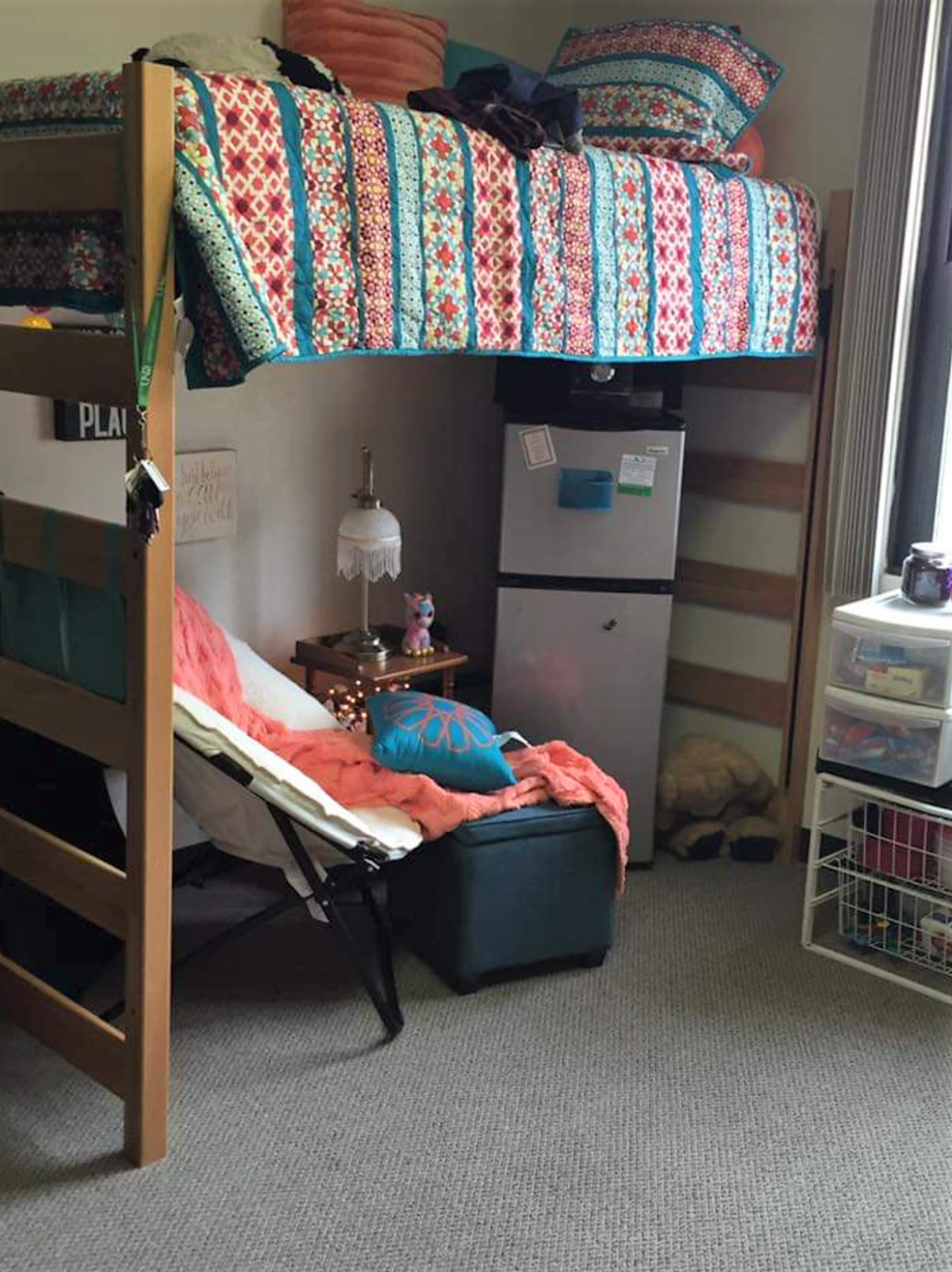 Most of the large furniture is already inside (like beds and dressers) but bring in your extra furniture in first. Many people bring futons or a lounge chair, so bring those in and assemble them first before you bring in your comforters and pictures. I had a white lounge chair, a side table, a mini fridge, and my storage containers. If you have those, move the biggest things in first, and then go smaller. Before however you move in the furniture. Get your bed the height you want and where you want it. Plan out your furniture location when you get there. It will save you so much time and energy. To wrap it up tip #2: Plan your furniture arrangement and move large stuff in first!